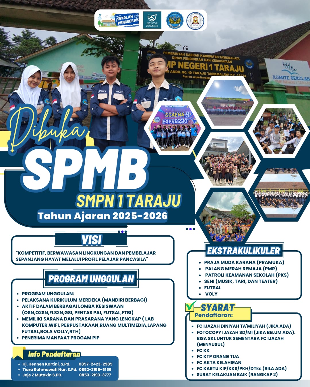 Kami mengundang Anda untuk bergabung dengan kami dan menjadi bagian dari keluarga besar SMPN 1 Taraju, di mana pendidikan yang berkualitas dan pembentukan karakter yang kuat menjadi prioritas utama kami. Mari wujudkan masa depan gemilang bersama di SMP Negeri 1 Taraju!.